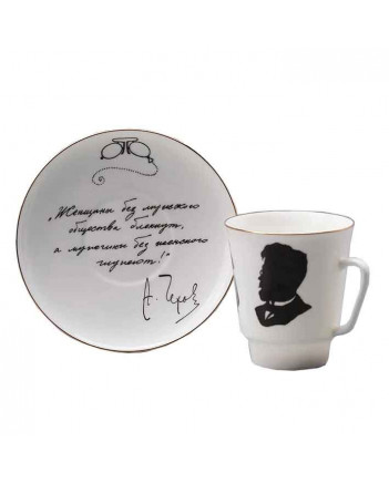 This elegant coffee set from the Russian Writers collection is dedicated to the great Anton Pavlovich Chekhov. Artist Sergei Sokolov chose as the central decorative theme the silhouettes of Chekhov himself, characters from his stories, and the writer’s iconic pince-nez, which he treasured. The saucer features a line from Chekhov’s notebooks: “Women without the company of men fade, while men without the company of women grow stupid.”