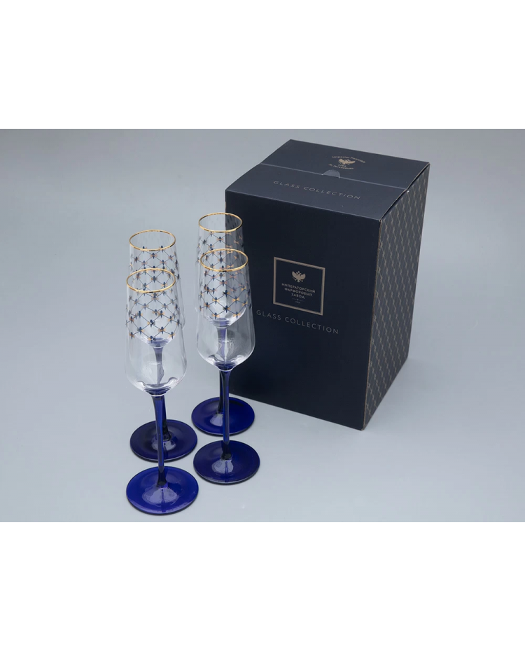 LOMONOSOV IMPERIAL GLASS CHAMPAGNE BUBBLY WINE COBALT NET SET 4 PC 200 ML